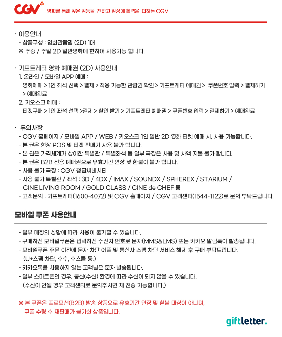 - 고객문의 : 기프트레터(1600-4072) 및 CGV 홈페이지 / CGV 고객센터(1544-1122)로 문의바랍니다.